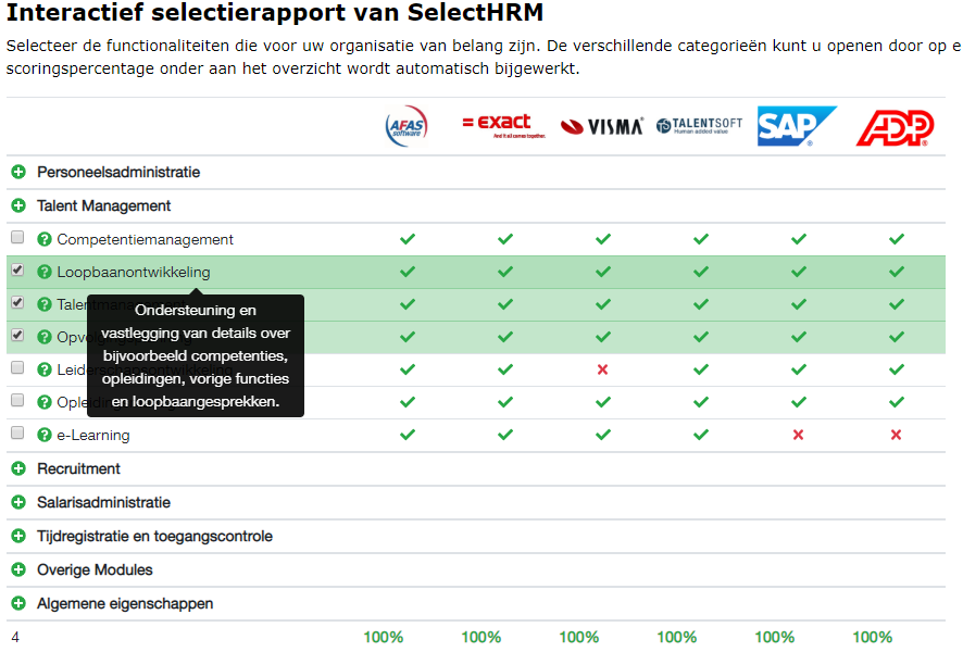 De HR experts van Select hebben interactieve tool ontwikkeld op basis van de belangrijkste criteria voor HRM software selectie. Deze online checklist is gratis beschikbaar in het informatiepakket. Hieronder een voorbeeld van de vragenlijst die u kunt verwachten.